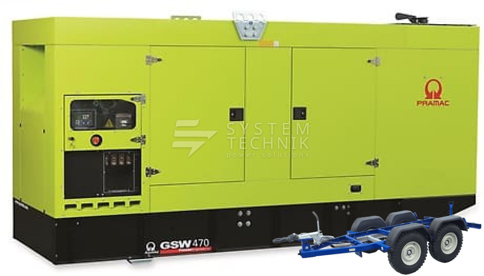 - Дизельный генератор Pramac GSW 470 P 380V В кожухе на прицепе